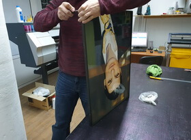 Затем из металлического профиля мы изготавливаем рамку, тыльную сторону которой закрывает прямоугольный белый фон. Распечатанный на плёнке портрет мы приклеиваем к вспененной основе для придания необходимого объёма и жесткости.