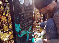 С помощью переносного пескоструйного аппарата мы нанесли на надгробье новые гравировки.