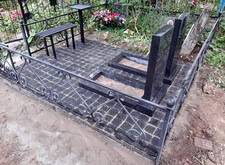 В данном заказе нам предстояло полностью благоустроить место захоронения. Клиент пожелал заменить на участке всё, кроме ограждения. Нам предстояло изготовить два классических гранитных памятника с прямоугольными цветниками, а также выложить территорию могилы брусчаткой. Первым делом мы приехали на кладбище и оценили исходное состояние места захоронения: оно поросло сорняком, а потому выглядело заброшенным.