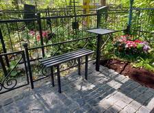 Уложенную на пескобетон брусчатку замыли водой, предварительно установив заказанные клиентом лавочку и столик. В это же время мы смыли образовавшуюся в процессе работы пыль с памятников и оградки.