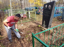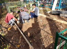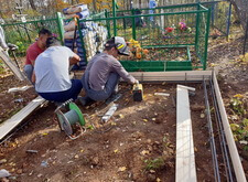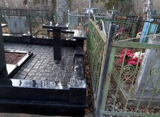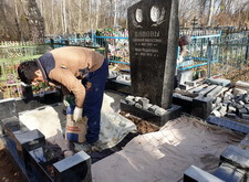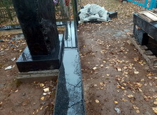 Дождавшись окончательного высыхания брусчатки вновь приезжаем на участок. Там мы восстанавливаем надписи на надгробье, размещая у его подножья восьмиконечный крестик. На этом наша работа на данном участке окончательно завершена. В результате из ничем не примечательной могилы появился презентабельный мемориальный комплекс, декорированный столиком и двумя лавочками в оградке.