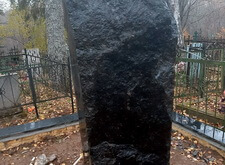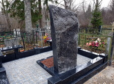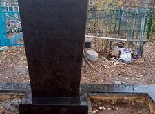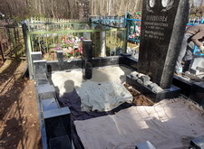 Так выглядит место захоронения во время промежуточного этапа работы: бетонный цоколь облицован гранитом, массивное надгробье установлено на своё новое место.