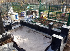 Вернувшись на участок, мы устанавливаем по периметру места захоронения гранитное ограждение, состоящее из невысоких столбиков и толстых балок. На углах оградки предусмотрены возвышения для лавочек. Параллельно мы застилаем территорию места захоронения геотекстилем – необходимой подложкой для любого наземного покрытия.