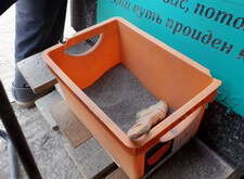 Так выглядело надгробье на момент окончания работ: трафарет остался на памятнике, закрывая отполированное надгробье и свеженанесённую надпись.