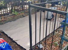 Первый этап работы – очистка и подготовка места захоронения к дальнейшим работам. Мы вынесли памятник, срезали старое ограждение, очистили землю от травы и иного мусора. Далее разметили площадь участка и укрыли её геотекстилем.