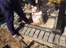 Укладываем брусчатку на пескобетон, которую затем просыпаем пескобетонной смесью.