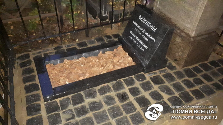 Взамен старой плиты устанавливаем небольшое надгробье из гранита перед массивной стелой, оформляем у его подножья цветник. Периметр получившейся композиции выкладываем гранитной брусчаткой. В результате у нас получилось бюджетная реконструкция половины места захоронения, второй частью клиент не позволил заниматься по личным причинам.