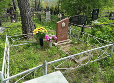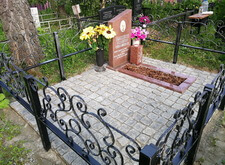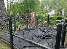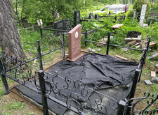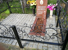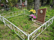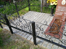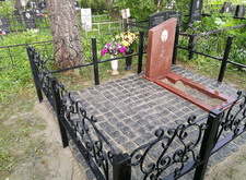 Так выглядело место захоронения на момент окончания работ: оградка заменена, памятник дополнен цветником и вазой, земля укрыта брусчаткой. Помимо этого, мы покрыли секции ограждения серебрянкой.